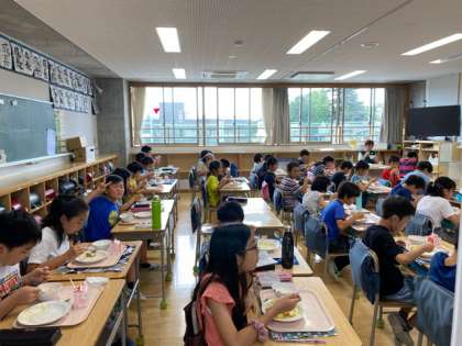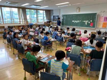 おいしく栄養たっぷりの給食が始まりました。どのクラスも静かに笑顔で食べていました。