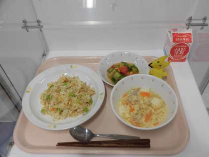 9/4 本日の給食 公開日 2020/09/04 更新日 2020/09/07 給食 【献立】 枝豆じゃこチャーハン・きゅうりとトマトのサラダ・酸辣湯・牛乳 食材の産地 閉じる 米・・・・・・山形県 豚肉・・・・・青森県 たまご・・・・群馬県 じゃこ・・・・愛知県 人参・玉ねぎ・枝豆 ・・・・北海道 トマト・・・・青森県 長ねぎ・・・・秋田県 きゅうり・・・岩手県 いいね(0) 学校行事