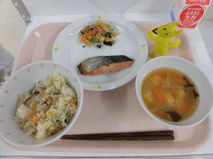 秋の香りご飯・鮭の照り焼き・カリカリ油揚げと野菜のおひたし・みそ汁・牛乳