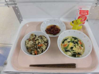 ひじきごはん・かき玉汁・うずら豆の煮豆・牛乳