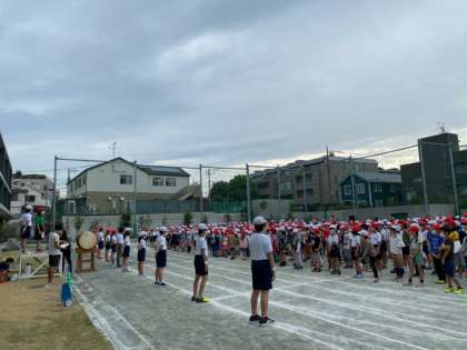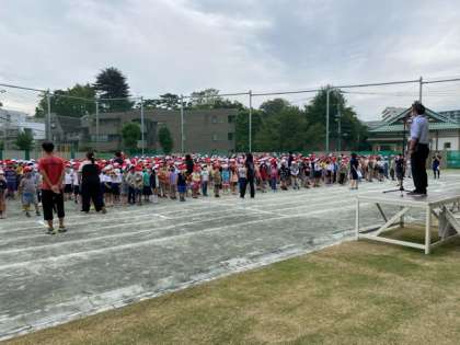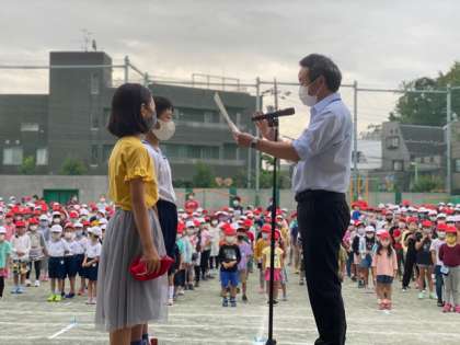校庭での初めての全校朝会でした。交通安全についての表彰や応援の練習も行いました。