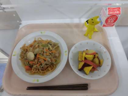 豚肉ともやしのあんかけそば・りんごとさつま芋の揚げ煮・牛乳