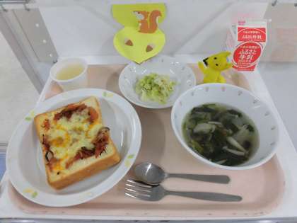 じゃこいりピザトースト・ザワークラウト風キャベツサラダ・ホッツェンプロッツのきのこスープ・りんごゼリー・牛乳