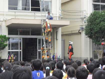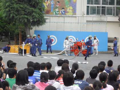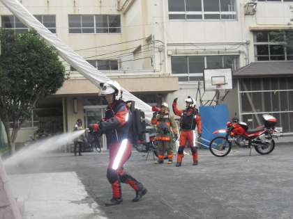 消防署による消防車・赤バイクによる救助・消火訓練を見学し、わたしたちのくらしの安全が守られていることを実感したひとときでした。その後、アルファ米のカレー給食を食べました。