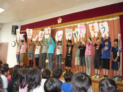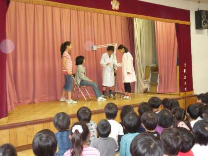 6月は5、6年生の保健委員の児童が虫歯予防のための劇を見せてくれました。子どもたちは真剣に見ていました。