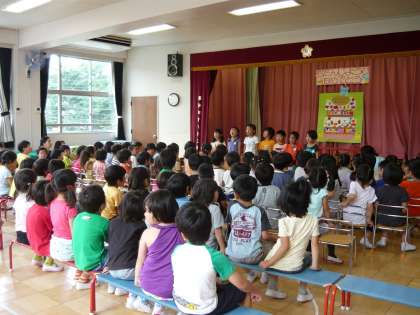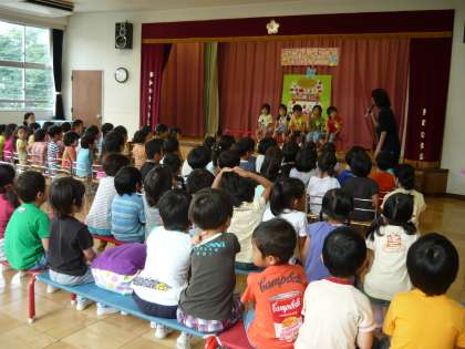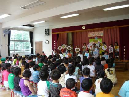 月ごとの誕生会では、誕生児へのインタビューや出し物を見てお祝いします。