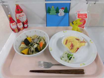 今日の給食は、かぼちゃ入りあったかい「ほうとう」とゆずを使いかぶを浅漬けにしました。
