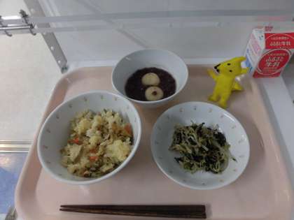 豚肉とごぼうのごはん・ほうれん草の乾物あえ・白玉ぜんざい・牛乳