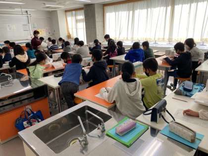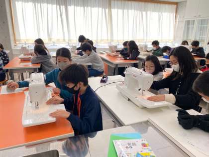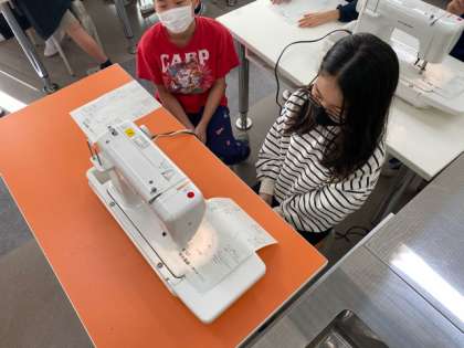 ミシンを初めて使います。先生の話をよく聞き、縫い始めます。昔は足踏みでしたね。