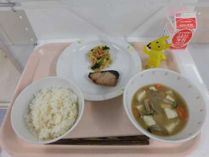 発芽玄米入りごはん・鰤の照り焼き・わさび和え・さつま汁・牛乳