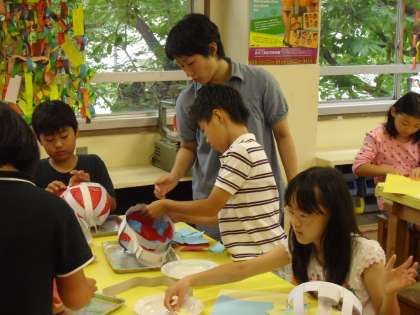 画用紙をのりで貼っていくと、世界でたった一つ楽しい帽子のできあがりです。