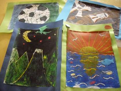 彫刻刀で彫っては刷り、彫っては刷り、1枚の紙に何色もの色を重ねました。