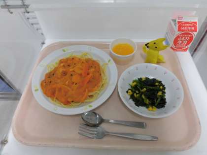 スパゲティーあけぼのソース・ほうれん草とコーンのソテー・フルーツゼリー・牛乳