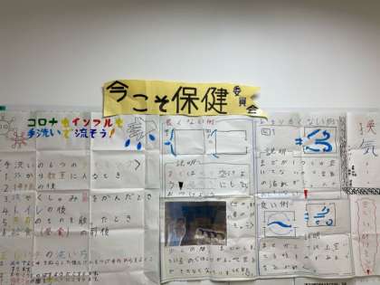 今こそ保健委員会の出番!ということで、保健委員の人たちは、「新型コロナウィルスの三つの顔を知ろう」(日本赤十字社)と関連付け、話し合いを行い、活動を広げています。「私たちにできること」についてのたくさんの葉っぱや木が、育ち続けています。