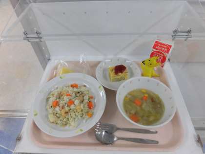 エビピラフ・スパニッシュオムレツ・コンソメスープ・冷凍りんご・セレクト飲み物(牛乳・コーヒー牛乳・りんごジュース・みかんジュース・緑茶の中から)