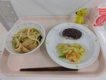 きつねうどん・野菜のおかかかけ・ぼた餅・牛乳