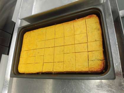 学校のふくさたまごは、後者でたけのこ、椎茸、玉ねぎ、人参のみじん切りを入れてスチームコンベクションオーブンで焼いてから蒸して作ります。