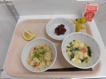 4/26 本日の給食 公開日 2021/04/26 更新日 2021/04/28 給食 【献立】 たけのこごはん・かき玉汁・うずら豆の煮豆・牛乳 今日は今が旬のたけのこのごはんです。 食材の産地 閉じる 米・・・・・岩手県 たけのこ・・熊本県・愛媛県 鶏卵・・・・群馬県 鶏肉・・・・岩手県 小松菜・・・埼玉県 長ねぎ・・・千葉県 さやえんどう ・・・愛知県 人参・・・・徳島県 ニューサマーオレンジ ・・・愛媛県 いいね(0) 学校行事