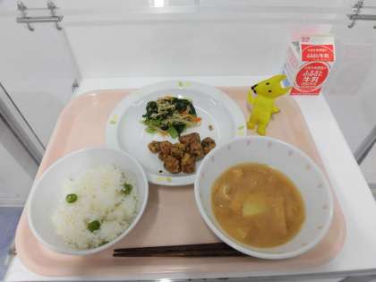 グリンピースごはん・鰹の揚げ煮・野菜のごまだれかけ・みそ汁・牛乳