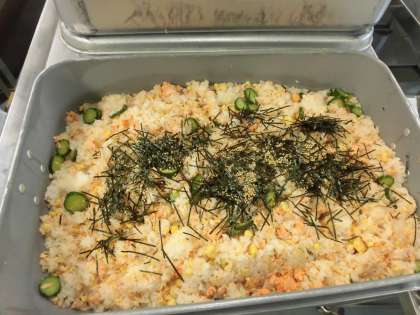 鮭を焼いてほぐし,すし飯にまぜます。