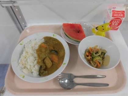 夏野菜カレーライス・こんにゃくサラダ・小玉すいか・牛乳