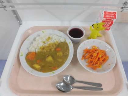 チキンカレーライス・キャロットラペ・グレープゼリー・牛乳