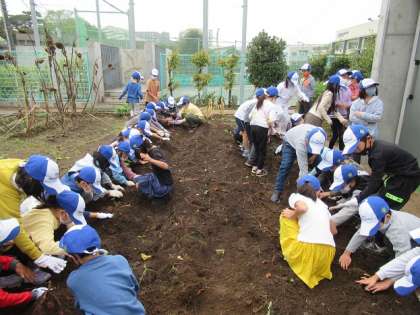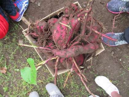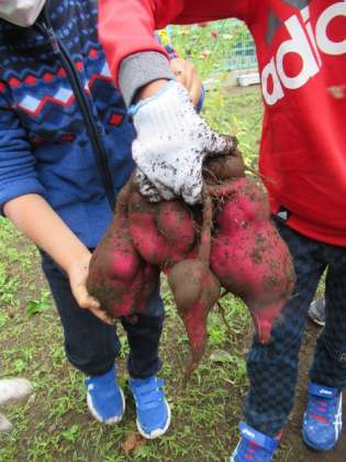 2年生が苗を植えたさつまいもがぐんぐん成長し、先日掘り起こして収穫しました。主事さんにもお世話になり、育てたさつまいもは、とっても大きくなっていました。苗を植えた頃には、しなしなになってしまった葉っぱを心配することもありましたが、まるでお化けカボチャのような大きいさつまいもも、育っていました。