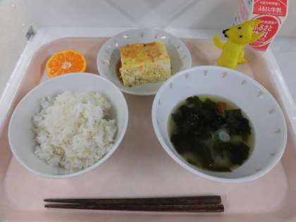 麦入りごはん・擬製豆腐・みそ汁・菊花みかん・牛乳