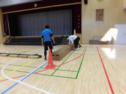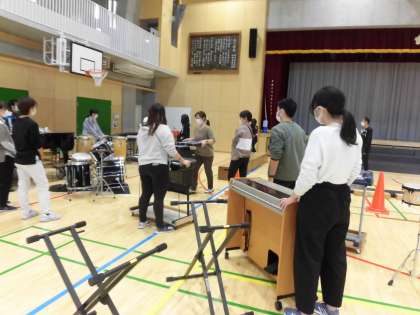 6年生が音楽室から運び出した楽器を教職員で体育館に入れ配置を検討しました。
