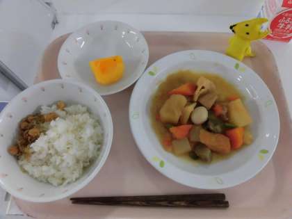 発芽玄米入りごはん・大豆とちりめんの佃煮・筑前煮・柿・牛乳