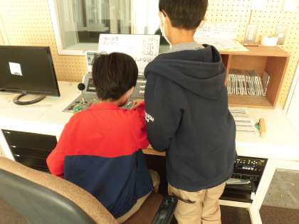 今朝の放送室では、6年生が5年生にやさしくアドバイスをしながら放送を行いました。