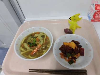 カレー南蛮・レバーとポテトのケチャップ和え・牛乳