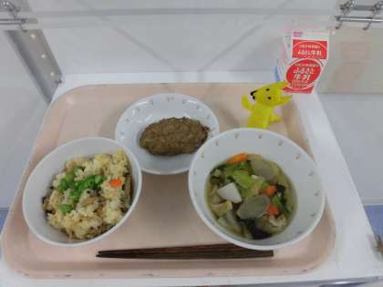 吹き寄せごはん・山家(さんが)焼き・根菜汁・牛乳