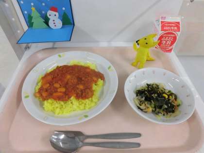 12/1 本日の給食 公開日 2021/12/01 更新日 2021/12/03 給食 【献立】 ターメリックライス・チリビーンズ・海藻サラダ・牛乳 今日から12月。冬も本番になってきます。 しっかり食べて、しっかり体を動かし、十分な睡眠をとって 冬を元気に乗り切れるようにしましょう♪ 食材の産地 閉じる 米・・・・・千葉県 豚肉・・・・青森県 豚レバー・・群馬県 玉ねぎ・じゃが芋 ・・・北海道 にんにく・・青森県 人参・きゅうり ・・千葉県 キャベツ・・埼玉県 いいね(0) 学校行事