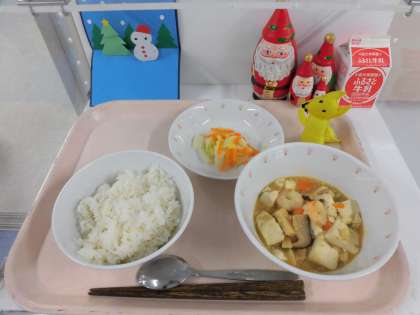 12/6 本日の給食 公開日 2021/12/06 更新日 2021/12/09 給食 【献立】 麦入りごはん・四川豆腐・辣白菜・牛乳 今日は、とても寒い日になりました。 中国の寒さが厳しい地方、四川省の料理、四川豆腐とごはんをしっかり食べて、体の中から温かくなるようにしたいですね! 食材の産地 閉じる 米・・・・・千葉県 豚肉・・・・青森県 えび・・・・ミャンマー にんにく・・青森県 長ねぎ・・・群馬県 白菜・・・・茨城県 人参・・・・千葉県 生姜・・・・熊本県 いいね(0) 学校行事