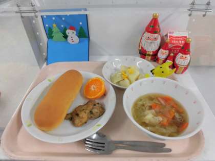 コッペパン・ジャークチキン・コーンポテト・白インゲンのスープ・菊花みかん・牛乳