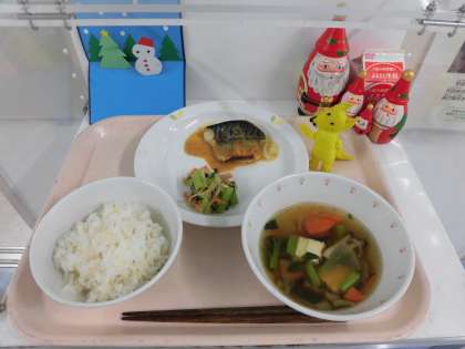 麦入りごはん・鯖のごまだれかけ・野菜のからし和え・のっぺい汁・牛乳