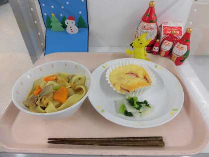 かぼちゃのほうとう・かぶの柚漬け・りんごのヨーグルトケーキ・牛乳