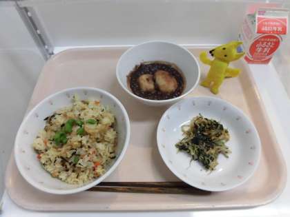 五目ごはん・ほうれん草の乾物和え・白玉ぜんざい・牛乳