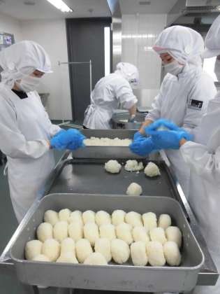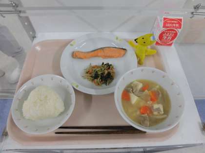塩むすび・鮭の塩焼き・ごま和え・粕入りみそ汁・牛乳