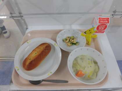 ガーリックフランス・白菜のクリームシチュー・ビーンズサラダ・牛乳