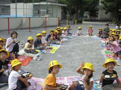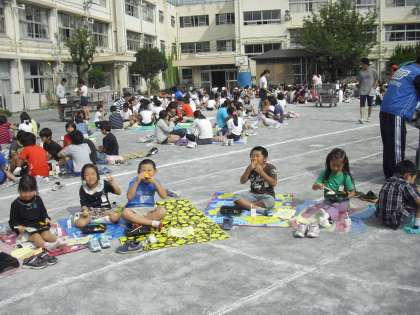 今日は全校児童・教職員そろって、校庭での青空お弁当給食を行いました。