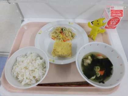 麦いりごはん・切り干し大根の卵焼き・焼きビーフン・わかめスープ・牛乳