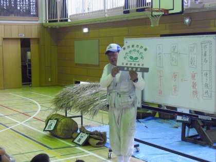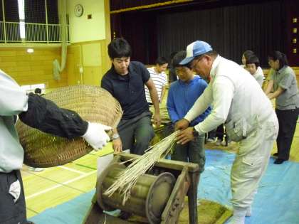 世田谷区内で農業を営んでいる高橋さんと農協の職員の方をお招きして米の脱穀作業をしました。