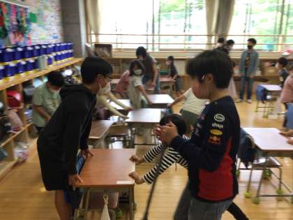 ほうきの掃き方や机の運び方を丁寧に説明していました。