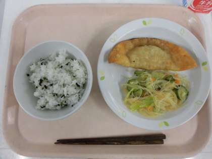 今日は、子どもたちに大人にも大人気のジャンボ餃子でした。ひき肉と刻んだ野菜と調味料を混ぜてよーく練って、一つ一つ大きな皮に包んで油で揚げて作りました。1・2年生、3・4年生、5・6年生用に、具の量を計算して量りながら、3種類の大きさに分けて作っています。皮は、麺屋さんに特注の直径15cmの餃子の皮です。とっても美味しく出来たので、たくさんの教室で、おかわりの行列ができていました。
