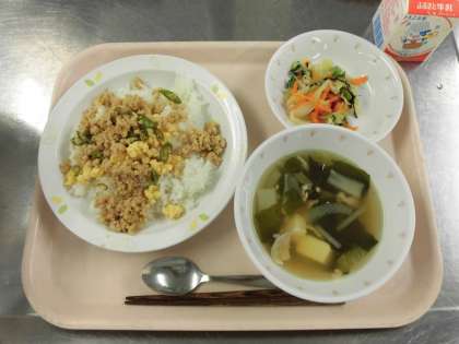 そぼろ丼は、鶏ひき肉と、高野豆腐を細かく切って、調味料と一緒に煮て作りました。ごはんの上にそぼろをのせて、さやいんげんと炒り卵もいっしょにいただきます。昆布サラダは、ゆでて冷やした野菜に塩昆布とドレッシングを混ぜました。野菜が苦手な人も、昆布のうまみといっしょに美味しく食べられるといいなと思います。
