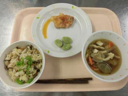 五目ごはんは、鶏肉、にんじん、ごぼう、しいたけ、油揚げ、こんにゃく、ひじきの7つの食材をおしょうゆなどの調味料で煮て、ごはんと混ぜました。いろいろな食材のおいしさがギュッとつまっています。鶏肉の南蛮焼きは、ねぎとしょうが入りの、ピリ辛ダレを鶏肉にかけます。そして、今が旬のそら豆は、大きくて美味しそうなものが届きました。ゆでてお塩をまぶします。苦手な人も、一粒でも味わってもらえたらいいなと思います。