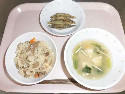 きびなごは、銀色の帯のような模様がある10cmくらいの魚です。鹿児島県で獲れたおいしいきびなごが届きました。下味をつけて、カレー粉と片栗粉をまぜた衣をつけて油でカリッと揚げました。骨も頭もやわらかくて丸ごと食べられるので、カルシウムをたくさんとることができます。よくかんて味わってみてほしいなと思います。