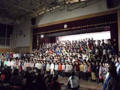 全校児童が集まって、美しい歌声を響かせました。